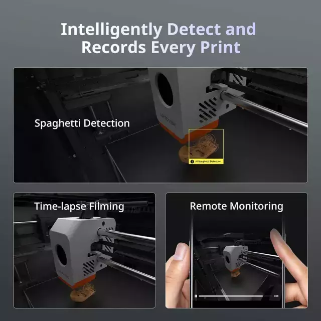 | IA y seguridad | Detección de spaghetti, monitor de tensión de correa, resume por corte y cámara HD para timelapse/seguimiento. |